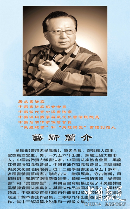 吴风银,又名吴凤银,斋号疯人斋主、疯爷堂主。笔名金艮。黑龙江省大庆市人。中国书法家协会会员,黑龙江省书法家协会会员,中国石油作家协会会员。深圳(光明区)吴风银书法院院长。独创了三种新奇唯美、独树一帜的书法书体:分别是“吴体隶书”和“吴体隶变”以及“吴风银隶书体”。