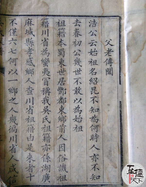 浩公云世際大乱,吴氏兄弟二人同逃至涪州,兄馮渡水,弟再三欲渡力弱不能,兄以手示弟令归原籍即为我等始祖,兄逃至城都,嘉庆时城都一人来称伊即兄之后裔,我族前辈詢伊行辈称伊为幺公录此使二族異日相遇不至为途人。
