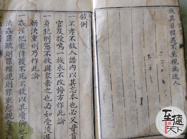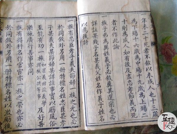 十二,族有忠臣孝子義夫節婦一族之光也必於同叙,外另用一册特标名姓忠臣某孝子某義夫某節婦某詳註事实以勵風俗至能有功一族(如置義田設義学 與族公共等事)及好善樂施廣行善事亦同。