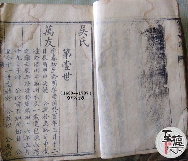萬友,字春初,生于明季崇桢癸酉年(公元1633年)三月十二日辰時,甲申兵变,公避于忠路司中復避於涪州平西洲未及一载,遭包陈劫掳之难,壬辰年归殁于康熙四十六年(公元1707年)五月十九日子時。公以前不知所始祖自公至今十一世悉始於 公故以 公为始祖,墓离吴家湾半里許。享年七十四岁。妣傅氏承厚傅公四女也,壬辰年適春初公生子自泰,生時殁期無徒杳载墓居春初公墓上相去八九尺。(未完待续)