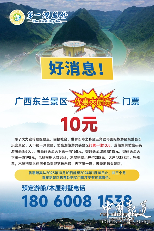 中国报道讯(通讯员岑福山)据广西第一湾国际旅游股份有限公司有关负责人介绍,为回报社会,游世界长寿之乡金三角巴马国际旅游区东兰县长乐宫景区,天下第一湾景区,坡豪湖旅游码头景区门票一律仅为10元。