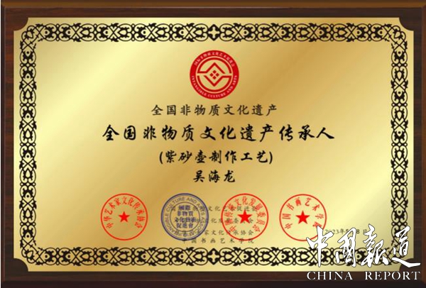 2023年4月,吴海龙在国家素质教育行业中展现了极强的专业性,被北京美育中培职业鉴定中心邀请担任“素质教育导师”,协助素质教育有序地开展,推动素质教育工作的落地和实施;吴海龙先生曾将自己精心制作的“天下为公”紫砂扁鼓壶捐赠给江苏钟山宾馆集团有限公司,体现了他无私奉献的大爱;2023年9月荣获了“国务礼交礼品师”称号;2019 年 6 月,荣获了中国紫砂“薪火相传”国家工艺美术大师特殊贡献奖;2018 年 7月 20 日,其作品《彩蝶壶》荣获了中国工合“一带一路”艺术文化节暨手工艺大师精品展“工合杯”金奖等等......这一系列伟大的成就无不展现出了吴海龙大师高尚的匠人精神。既有对陶艺精益求精的严于律己精神,又有精心学艺的勤奋进取精神,这一系列高风亮节的精神无不激励着一批又一批的年轻人更加矢志不渝地不懈奋斗,源源不断地投入到国家和民族伟大复兴的事业中来。