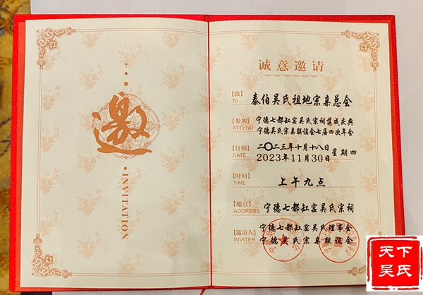 在无锡君来滨湖饭店欢迎晚宴上,吴亨禄向吴新会长呈送邀请函。据介绍,宁德七都缸窑吴氏宗祠落成庆典,宁德吴氏宗亲联谊会七届四次年会将于 2023年 11月 30日农历十月十八日隆重举办庆庆活动。吴新作为重要嘉宾代表祖地届时将组团出席盛会。