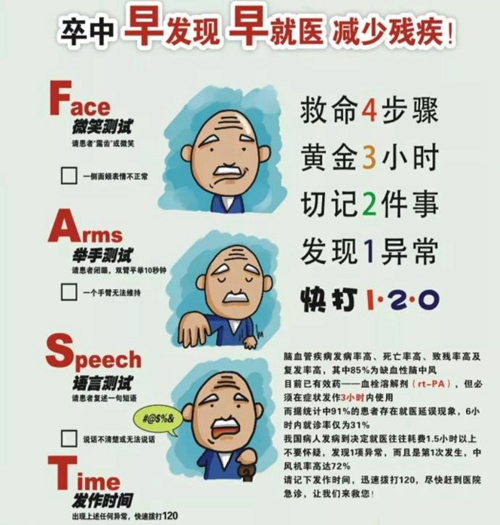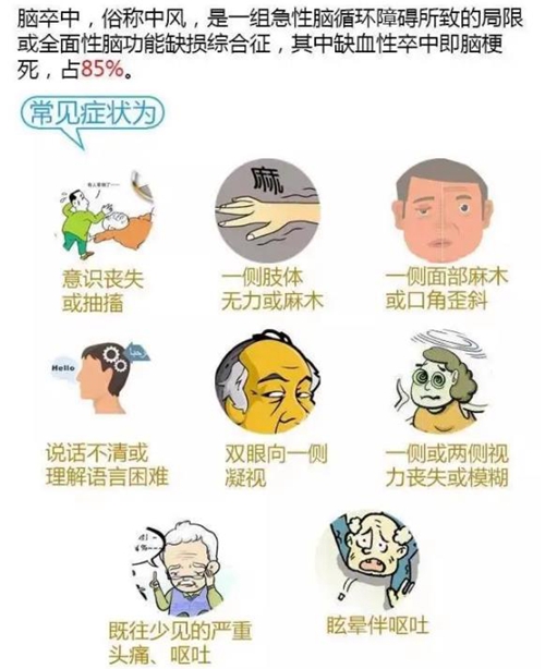 什么是中风?中风也称卒中,是一种急性脑血管疾病,是由于脑部血管突然破裂,或因血管阻塞导致血液不能流入大脑,而引起脑组织损伤的疾病。没有血液和氧气供应,缺血部分的脑组织就会出现坏死。坏死脑组织支配的躯体部分就会出现功能异常。