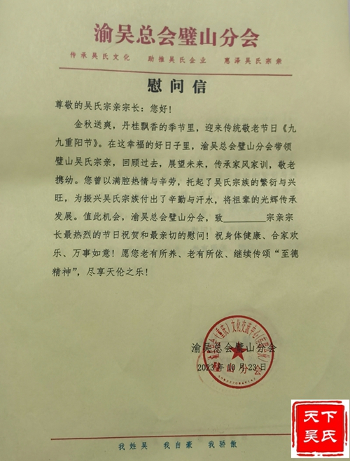 天下吴氏网讯(重庆璧山工作站吴波报道)10月22日,在重阳节来临之际,渝吴总会璧山分会在会长吴家顺,执行会长吴建军、吴礼学,常务副会长吴兆祥,副会长吴信才等秘书团队慰问部分九十岁以上吴氏老人获点赞。