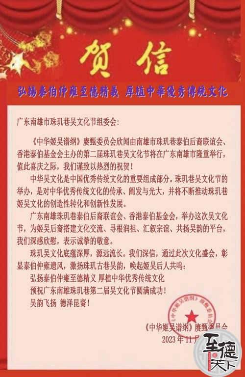 祝南雄市珠玑巷泰伯后裔联谊会、香港泰伯基金会繁荣昌盛! 祝愿南雄珠玑巷第二届吴文化节庆典活动圆满成功!