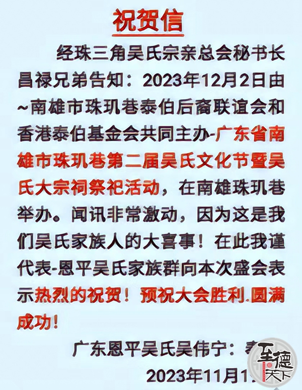 广东恩平吴伟宁致南雄市珠玑巷第二届吴氏文化节贺信