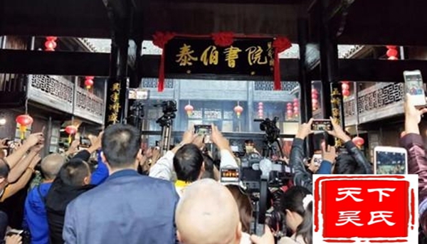 挂牌仪式由世吴会副主席、贵州至德文化研究会会长吴进华主持。远口吴氏总祠会长吴世平致欢迎辞;世吴会主席吴国荣宣读世吴总会对建设远口吴氏总祠泰伯书院的批复并讲话,讲话回顾了泰伯书院创建过程,肯定了泰伯书院创建的重大意义,获得了天下吴氏组织的广泛支持。在“泰伯书院”揭牌仪式上;世吴总会主席吴国荣、远口吴氏总祠执行会长吴位清、云宵县白塔绍德堂理事会会长吴健龙、中央民族大学教授吴宗金向泰伯公像鞠恭行礼上香,揭下由全国人大原委员长吴邦国手书的“泰伯书院”烫金牌匾红布,在场嘉宾上香并行礼。