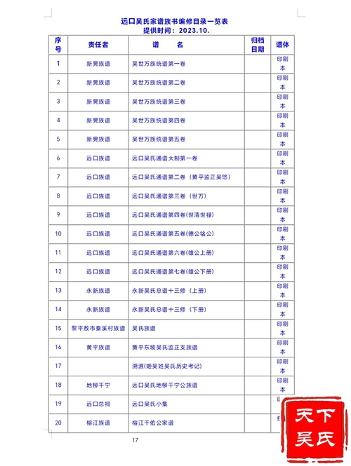 远口吴氏谱牒《远口吴氏通谱》 本书是中华人民共和国成立后,由贵州远口吴氏通谱编纂委员会,于2000年12月编印出版的第一部远口吴氏族谱。《远口吴氏通谱》总顾问吴恒章,编委主任吴定发,主编吴展明,副主编吴家治、吴恒传、吴远钧。本谱采用章节体,由序言、凡例、概述、世系、人物、文化、捐资、附录、后记、图照等部类组成。横排版,16开精装本,7分册约900万字。以世系和人物为主体,记述了远口吴氏从盛公至2000年共700多年的发展历史。