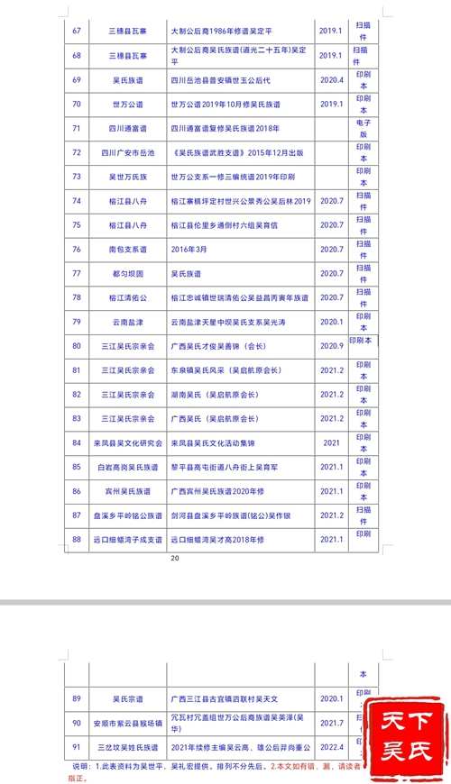 《白洗吴氏族谱(一修)》  吴永康主编,本书由贵州施秉县白洗劳动侯闾漾吴氏支系编修,2021年12月线装印刷出版。全书307页37.58万字,印数700册。全书由3篇5章17节构成,内容包括吴氏渊源之传说、吴姓源流、漾梭分谱世系、字辈、世系图、人物录、捐资集资。正文前后设前言、凡例、后记、引信录组成。除上述书目之外,远口吴氏各支各地编修族谱和介绍远口吴氏的书籍众多,为远口吴氏文化传承做了重要的基础性工作,为远口吴氏文化播迁作出了重大贡献。远口吴氏编修族谱情况详见附录:《远口吴氏家谱编修目录一览表》