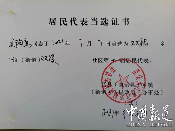 2021年7月1日,当选江津双福街道双溪社区第十一届居民代表。
