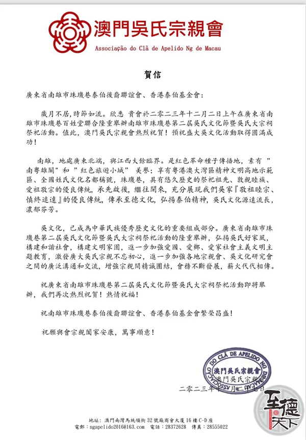 澳门吴氏宗亲会致南雄第二届吴文化节贺信