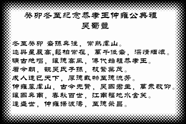 冬至癸卯 裔孙奔往,常熟虞山。迹与星辰高,松柏常在,万千后裔,深情缅怀。旷古绝唱,让德高风,传代始祖恭孝王。看今朝,观吴氏子孙,枝繁叶茂。成人达己天下,厚德载物至德流芳。仲雍墓虞山,古今先贤,吴国君主,万众敬仰。让国奔南,春秋百世,江南福地水含笑。逢盛世,仲雍扬波涛,至德荣昌。