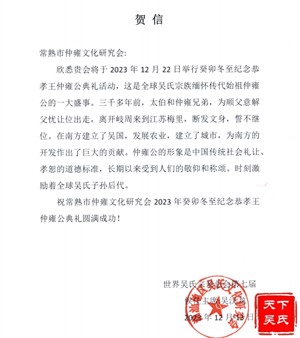 香港世界吴氏宗亲总会致常熟仲雍公祭祀典礼