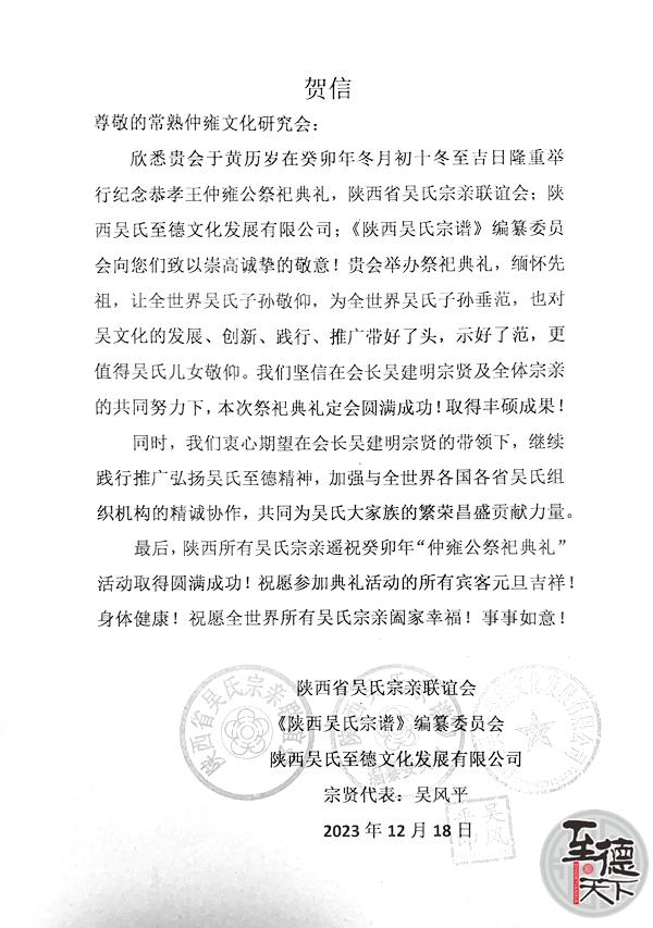 欣悉贵会于黄历岁在癸卯年冬月初十冬至吉日隆重举行纪念恭孝王仲雍公祭祀典礼,陕西省吴氏宗亲联谊会;陕西吴氏至德文化发展有限公司;《陕西吴氏宗谱》编纂委员会向您们致以崇高诚挚的敬意!贵会举办祭祀典礼,缅怀先祖,让全世界吴氏子孙敬仰,为全世界吴氏子孙垂范,也对吴文化的发展、创新、践行、推广带好了头,示好了范,更值得吴氏儿女敬仰。我们坚信在会长吴建明宗贤及全体宗亲的共同努力下,本次祭祀典礼定会圆满成功!取得丰硕成果!同时,我们衷心期望在会长吴建明宗贤的带领下,继续践行推广弘扬吴氏至德精神,加强与全世界各国各省吴氏组织机构的精诚协作,共同为吴氏大家族的繁荣昌盛贡献力量。