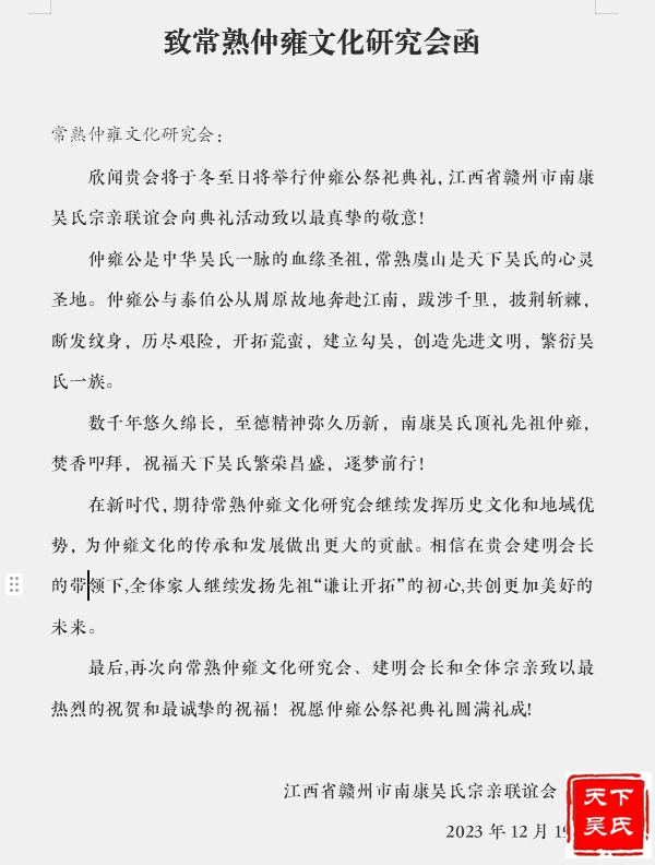 欣闻贵会将于冬至日将举行仲雍公祭祀典礼,江西省赣州市南康吴氏宗亲联谊会向典礼活动致以最真挚的敬意!仲雍公是中华吴氏一脉的血缘圣祖,常熟虞山是天下吴氏的心灵圣地。仲雍公与泰伯公从周原故地奔赴江南,跋涉千里,披荆斩棘,断发纹身,历尽艰险,开拓荒蛮,建立勾吴,创造先进文明,繁衍吴氏一族。数千年悠久绵长,至德精神弥久历新,南康吴氏顶礼先祖仲雍,焚香叩拜,祝福天下吴氏繁荣昌盛,逐梦前行!