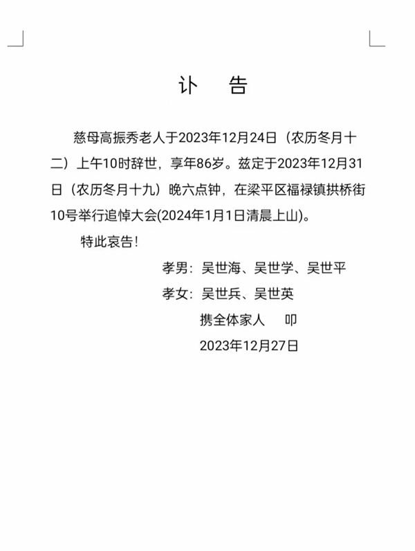 渝吴总会会长吴世平慈母高振秀逝世讣告