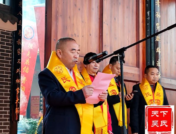主持人介绍参加仪式的嘉宾和领导,向大家庆典仪式的流程和各项礼仪。由南山村吴氏祠堂宗祠重建理事会理事吴里汉致欢迎辞。南山村吴氏祠堂宗祠重建理事会理事吴小明介祠建设情况,集体诵读吴氏家训,宣读贺信贺礼名单,河南固始县代表祖地致贺词,捐资企业家代表致贺词,南平市吴文化研究会会长吴民友致贺词,延平区政协,南山镇政府,福建省吴氏宗亲总会等代表先后致词。吴氏祠堂揭牌仪式,祭拜吴氏开姓始祖泰伯公,传代始祖仲雍公入迁始祖并敬香叩拜及合影吴氏全家福。