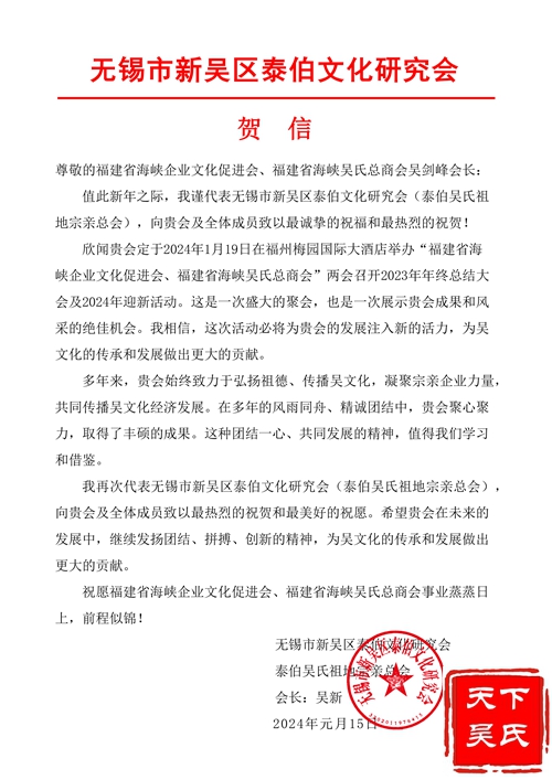 无锡市新吴区泰伯文化研究会致海吴总会贺电