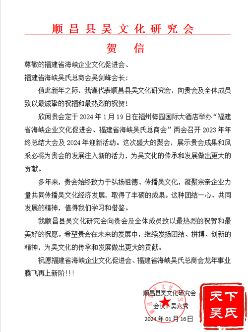 顺昌县吴文化研究会致海吴总会贺电