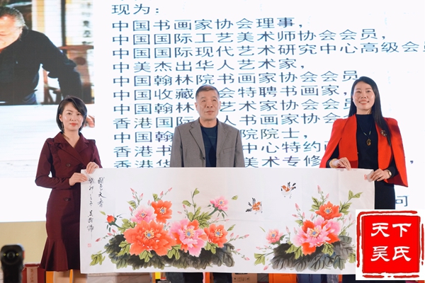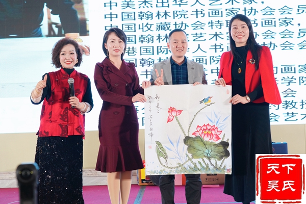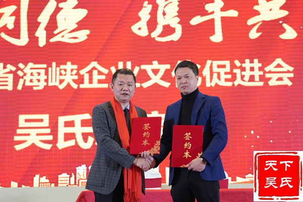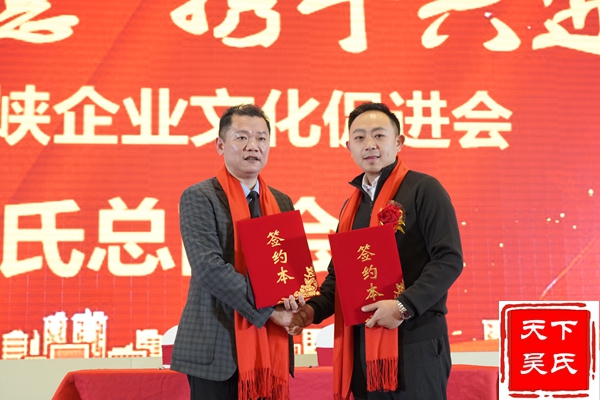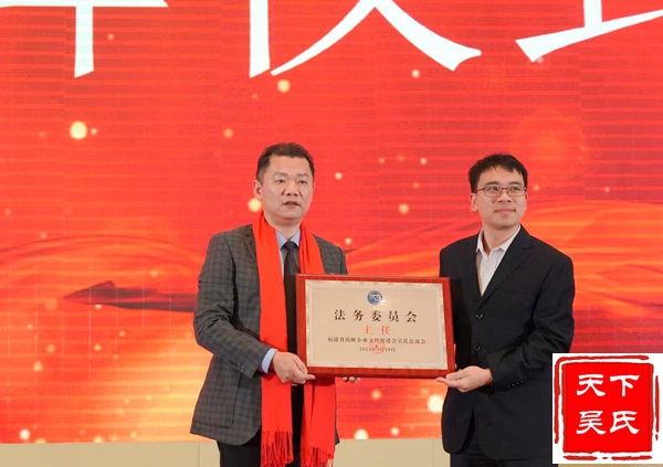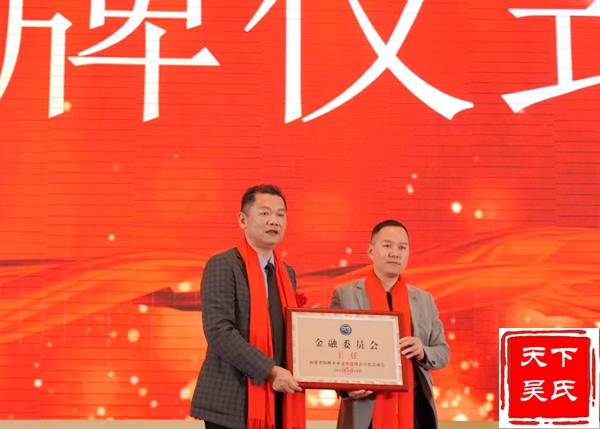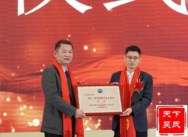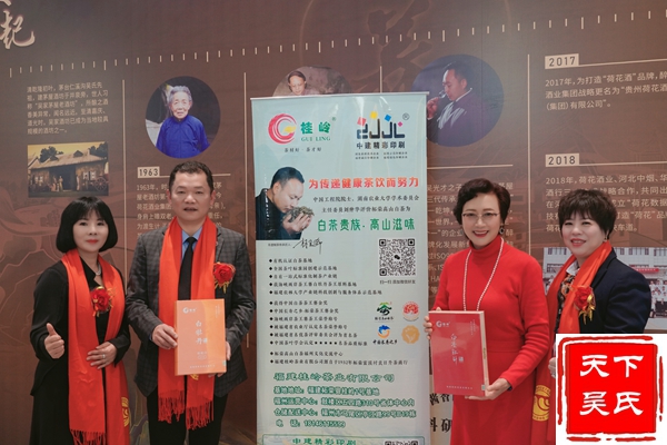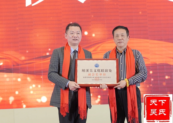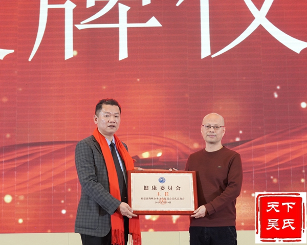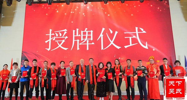 举行授牌颁匾仪式,(法务部、工程部、金融部、健康部)贵州荷花酒业集团有限公司 、福州市汉宗元生物科技有限公司合作签约,吴剑峰颁发牌匾、荣誉证书和先进工作者证书。杨华董事长上台精彩演讲。中华吴氏宗亲总会主席吴文富、秘书长吴君鹏致词。