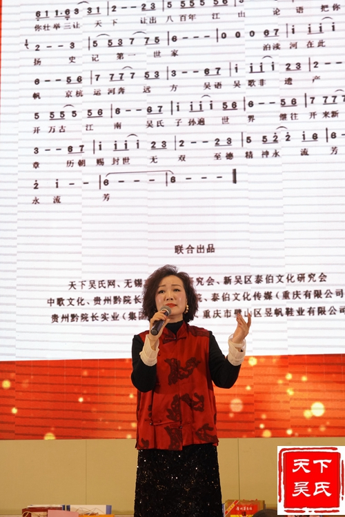 邓丽君模仿者甜歌皇后、福建省海峡文化促进会海峡吴氏总商会秘书长吴君君用甜美的歌喉演唱《亲吻吴梦》、《至德流芳》两首宗亲歌曲,舞台屏幕上播放着以往难忘的视频。