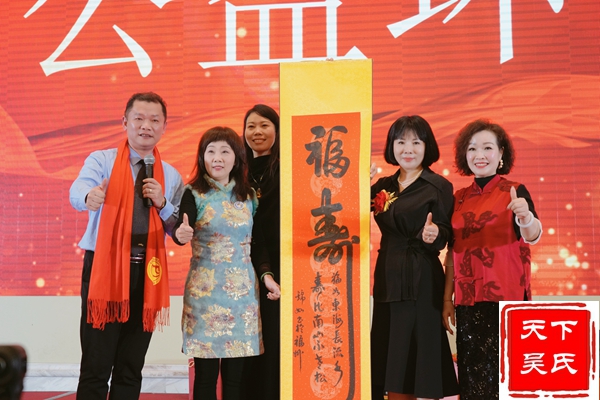 《恭喜发财》祝福音乐响起,财神爷(副秘书长吴平生装扮)带领企业单位及桌长上台做赞助产品展示!然后带大家走向会场为每桌宾朋送去财宝和祝福!互动环节也将晚宴推向了高潮,现场氛围活跃,掌声雷动。原江西歌舞剧院的独唱演员,非常出色的节目主持人,从事商贸企业的郭琴军演唱歌曲《奋斗的时代我们在一起》、《甜蜜蜜》。会场赞声不停。知名歌星陈珊女士声情并茂地演唱《一壶老酒》,陈艳芳、徐慧飞、赖新爱表演精彩小品演出《回海吴会之家》,增加了会场欢乐气氛。国家一级大师吴国辉老师作品和艺术品吴杰大师根雕作品慈善公益拍卖,余英爱心大使的拍卖品现场抢拍作品成功,瞬间被嘉宾抢拍走,幸运抽奖等丰富多彩的活动。