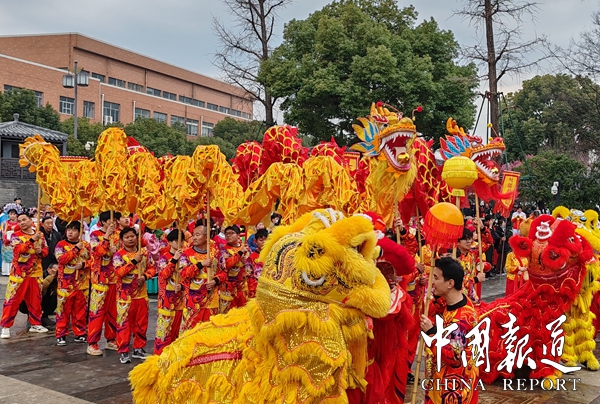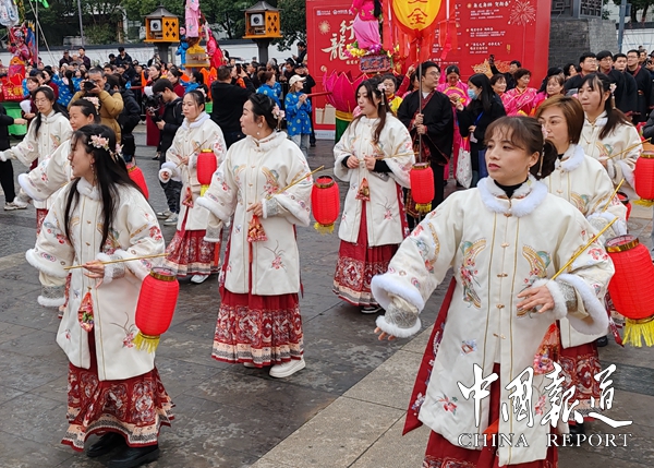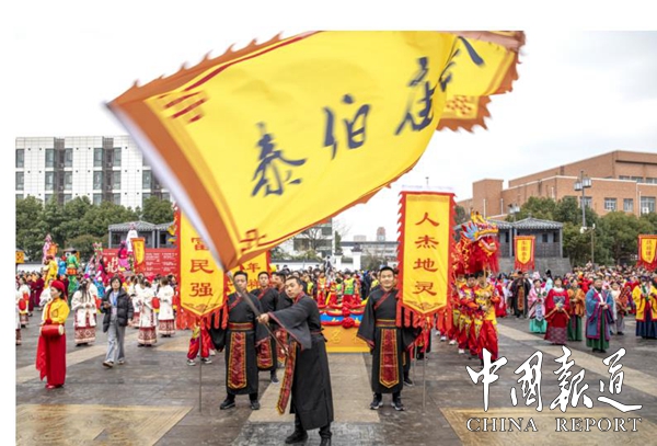 活动现场锣鼓喧天、热闹非凡。作为泰伯庙会的一大看点,极富地域特色的民俗巡游由来自梅村街道各社区的22支特色民俗队伍约400人组成,旗幡牌匾、舞龙舞狮、腰鼓、挑花篮、五福临门、汉服秀、旗袍秀等各类非遗、民间绝活流动表演,生动展示了绚丽多彩的江南民俗风情和梅里人民崇文善艺的精神面貌。