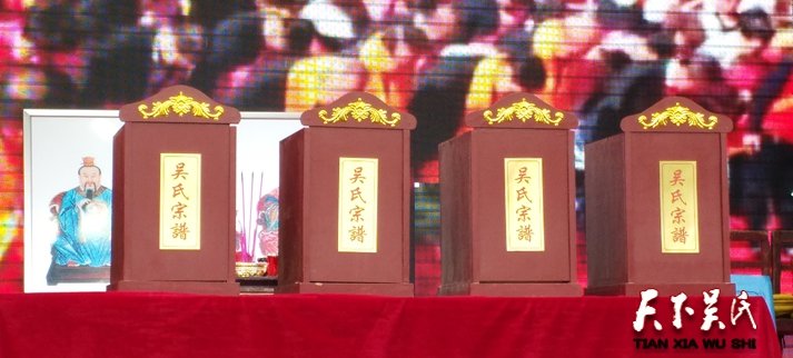 上午8点30分授谱大会开始。第一项播放吴氏颂歌,鸣放煸炮,向吴氏三公像,吴氏列祖列宗行鞠躬礼。第二项:由吴细涛宣布祝贺单位和个人,前来祝贺的有:湖北省吴会会长吴志刚,执行会长吴合林,常务副会长吴凤勤(吴熙仪),新洲吴氏会一行十人。红安吴会会长、堂祖天佑公裔孙吴(胡)振宇,红安堂祖天祥公裔孙吴正平、吴建国。