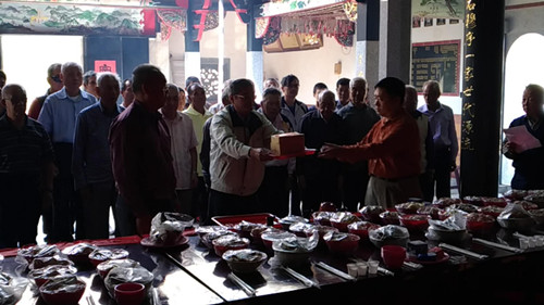 2017年10月28日上午11時整,來自金門全縣五鄉長宗親代表50餘人,在吳氏家廟內举行重陽節祭祖活動,頒發泰伯公獎學金。吳慕萱等25位宗親合計發出新台幣48500元整,感謝信浩理事捐贈新台幣壹萬元整作為獎學基金。