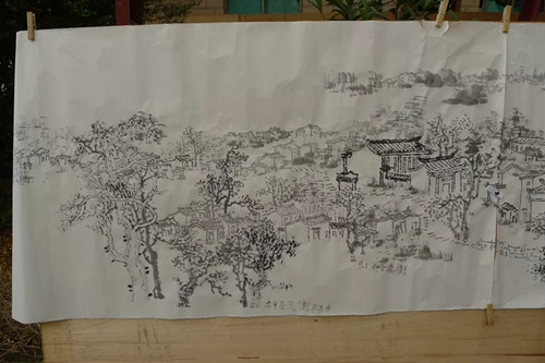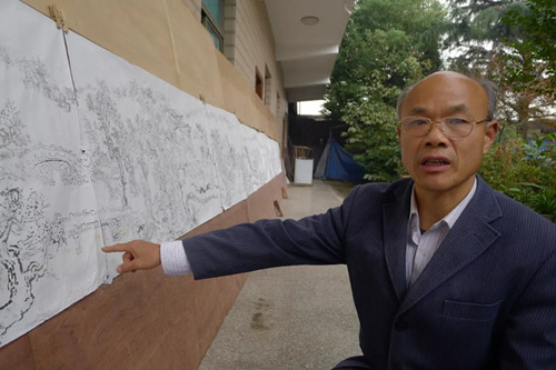 吴小平从今年8月下旬开始在宣庄村写生,积累素材。当时正是宣庄村民动迁搬家的时候,邻居家的门窗已经卸下,而吴小平坐在宣庄的老家,一笔一笔地画着他心中的宣庄。16天过去了,《千年古村宣庄》长卷和宣庄老街等单幅系列告成。