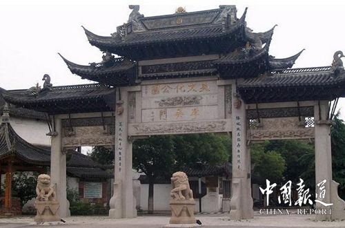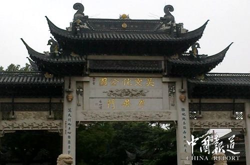 中国报道讯(记者吴蜀丰特约撰稿吴立新)吴文化公园,又称吴文化博览苑,旅游界称它为无锡民俗村。吴文化公园座落在江苏省无锡市惠山区堰桥镇西高山,是国内由农民捐资创办的第一座大型文化园林。占地46.7公顷,仿古建筑面积3.7万平方米。南濒太湖,北依长江,处于杭、沪、苏、锡、常金三角旅游线上,距无锡火车站13公里,硕放飞机场19公里,门口有贯通长江南北的锡澄公路,南侧是沪宁高速公路道口,交通便捷,是太湖风景区别具风趣的乡野文化景观。