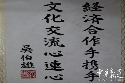据悉介绍,吴伯雄目前在台北荣民总医院调养休息。吴伯雄在修养期间,获悉2015首届海峡两岸吴文化节暨第二海峡海峡两岸吴氏宗亲恳亲大会暨第三届海峡两岸吴文化论坛将举办的消息,特地抽出时间挥毫题词,并于日前邮寄到福建。