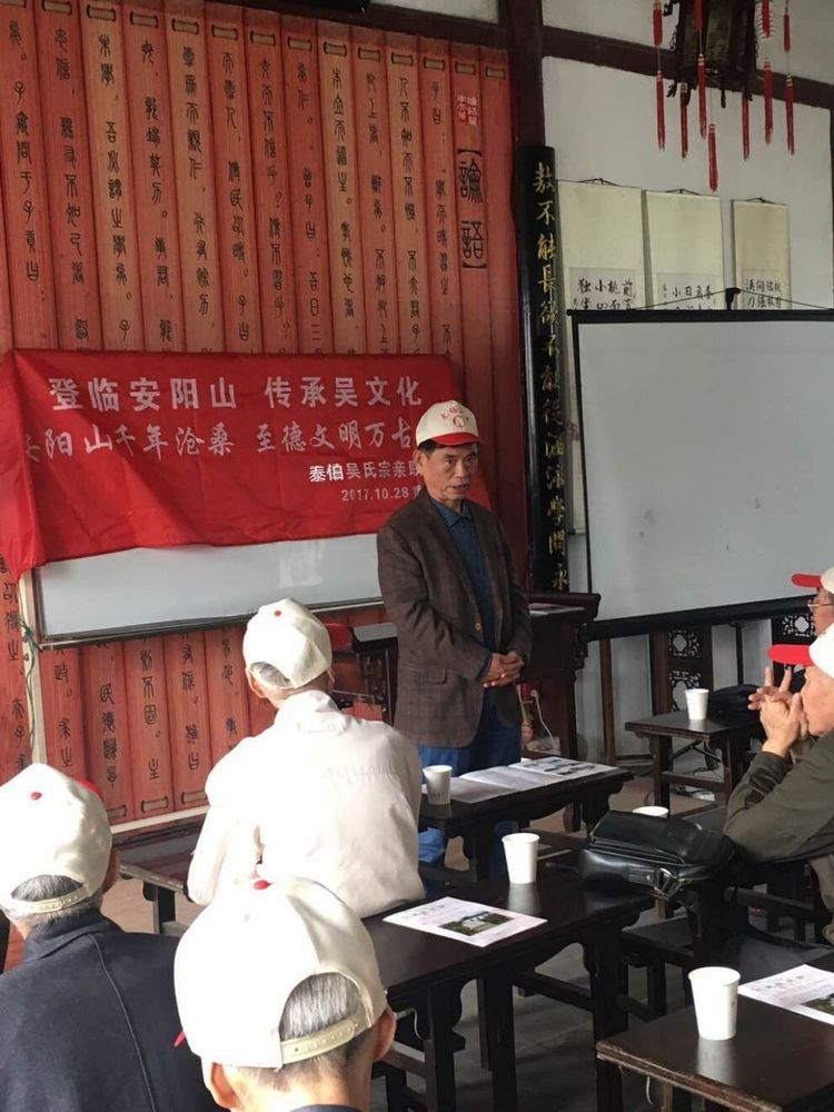 2017年10月23日,泰伯吴氏祖地宗亲总会会长吴立兴以及顾问委员会的负责人吴荣大等总会及顾问会领导,组织吴家老宗亲、老前辈五十余人,聚集在无锡水蜜桃之乡……美丽的安阳山,举行登临安阳山,参观吴文化遗存活动。