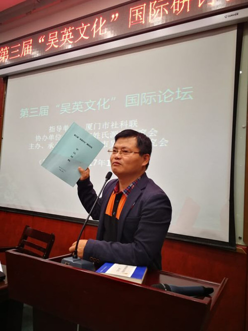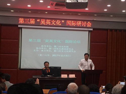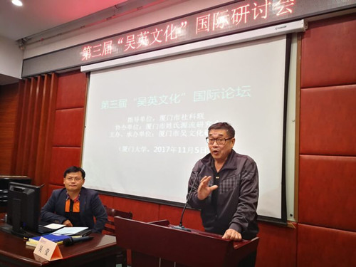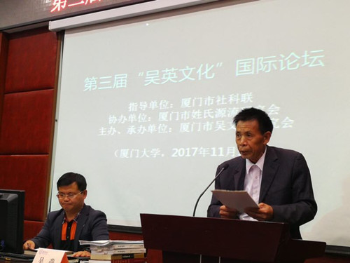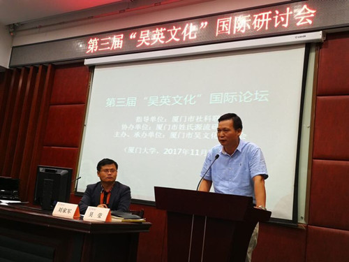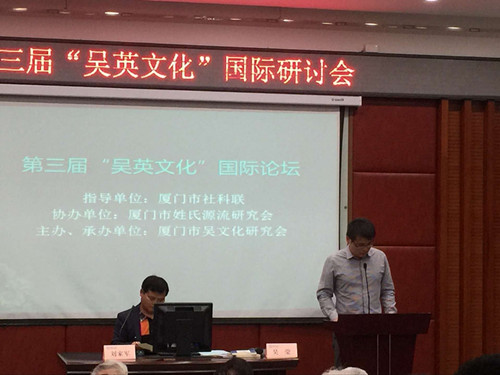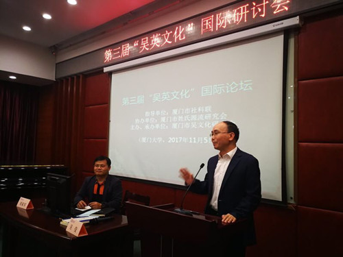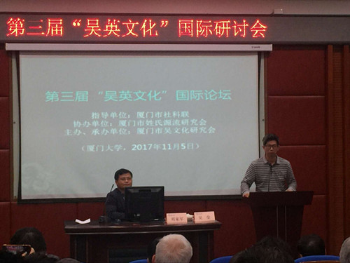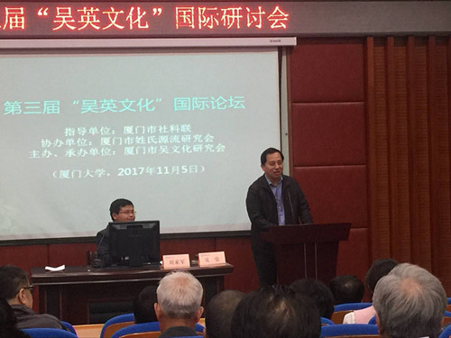 2017年11月5日下午,第三届“吴英文化”国际论坛在厦门大学南光101学术报告厅举行。本次活动是由厦门市社科联为指导单位、厦门市吴文化研究会为主办单位、厦门市姓氏源流研究会协办的一场关于“两岸吴英历史文献、田野实证及文化建设”的研讨会。
