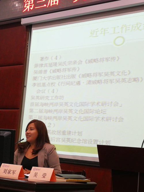 活动中,海峡两岸关系协会原副会长、厦门大学新闻学院院长张铭清、厦门大学台湾研究院院长刘国深、厦门大学人类学教授李祖基等厦门大学教授和来自台湾、龙海、漳州、菲律宾的专家学者共十八位作了发言。他们对吴英将军的人生实践、精神文化和民族文化等不同层面进行深入而广泛地探索,寻求其光辉人生的优秀思想资源。吴国荣会长从吴文化中的典型人物吴英与吴夲进行了阐述。吴建民等吴英后裔,从家族文化、家风传承进行讲解。