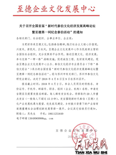 为更好传承至德文化,弘扬泰伯精神,践行社会主义核心价值观,兴家风、淳民风、正社风,至德企业文化发展中心作为民政部主管的全国性社会组织,充分发挥其平台作用,推动至德文化、经济发展,参与支持“一带一路”战略实施,促进诚信工程、良好家风建设,现由至德企业文化发展中心主办、泰伯文化经济专业委员会(下称"泰伯文经会")承办的全国首届"新时代泰伯文化经济发展高峰论坛暨至德第一祠纪念泰伯活动",经与苏州市有关部门、苏州市泰伯文化研究会商议,决定于2018年4月8日至9日在苏州召开。