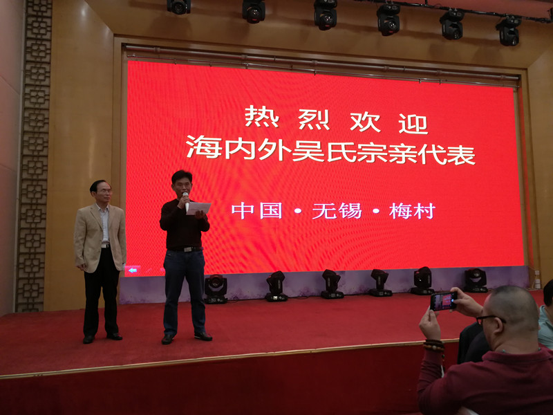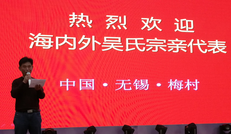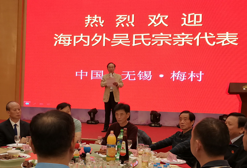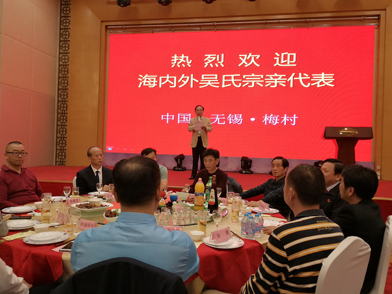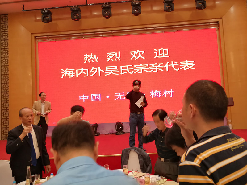 晚上七点组委会在无锡香梅国际大酒店举行盛大欢迎酒会!由《泰伯论坛》秘书长吴志云主持,首先新吴区梅村街道办事处尤伟主任发表欢迎词,接着泰伯吴氏祖地宗亲联谊总会吴立兴会长致祝酒词!整个酒会在热烈、温馨、和谐的氛围中进行。