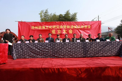 2017年10月28日,中国传统的九九重阳节,安徽省池州市贵池区里山街道白洋河畔,来自合肥、安庆和池州各地的150余名代表欢聚一堂,庆祝池州秋浦文化研究会暨秋浦吴氏宗亲会成立。会场设置在风景如画的白洋河畔,金秋十月天高气爽鸟语花香,喜庆的鞭炮和庄严的国歌,在青山绿水间回荡。