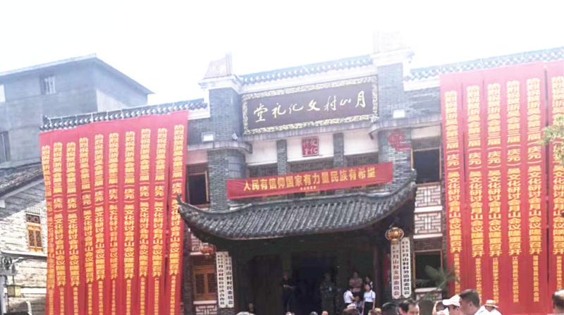 月山村, 月山又名金乡、东庄、举溪、举水,位于浙江省庆元县城东南57公里,月山村后山形如半月,村前溪水曲似银钩,村庄坐落其间,如同山环水抱的一轮圆月,故名月山。月山村首尾各有一块田土羊,分别称为“考坑土羊”和“梅花土羊”,六座古廊桥形如长虹卧波,亭台楼阁错落有致,展现出一幅“小桥、流水、人家”那恬然而优美的画卷,置身其中,宛若人间仙境。时任处州知府孙大儒曾赞月山为“山环水抱一桃源”。