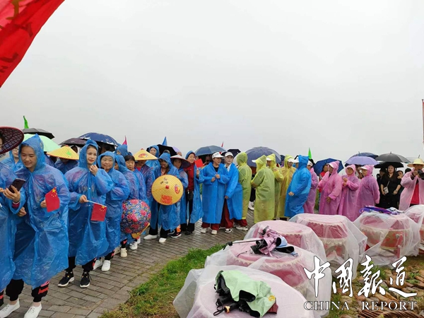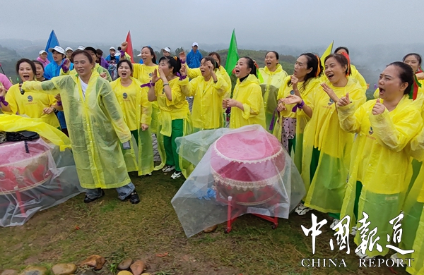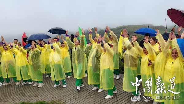 上午九点三十分,来自丰都县鬼城魅姊舞鼓舞队、丰都鬼城魅姊舞健身操团队、鬼城影子曳步舞、水花似朵曳舞团、丰都晴天曳舞健身团、名山广场舞健身队及周边附近村民近千余人在云上花顶台观景台共同庆贺农民丰收节。5家表演方队达218名表演者着黄色雨衣,在“你方唱罢,我登场”互动中,摆手舞、漫舞蹈、快节奏等丰富多彩的演出内容将现场氛围推向多次高潮,村民们也掏出手机各取镜头记录分享这难忘的精彩瞬间。