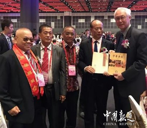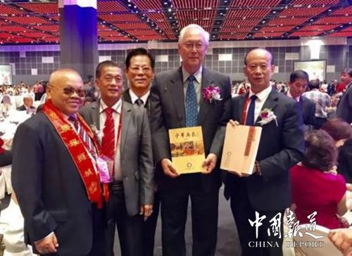 祖籍泉州的新加坡前总理吴作栋先生接受中华吴氏宗亲总会主席吴文富博士赠送的《中华吴氏》会刊并合影留念。
