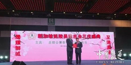 中国报道讯(记者吴蜀丰特约采编 吴谨程)辉煌九十载,品鉴岁月香。2017年10月29日,新加坡延陵吴氏总会“三庆盛典”在狮城隆重举行。中华吴氏总会主席吴文富博士率中华吴氏各地宗亲代表团参会。