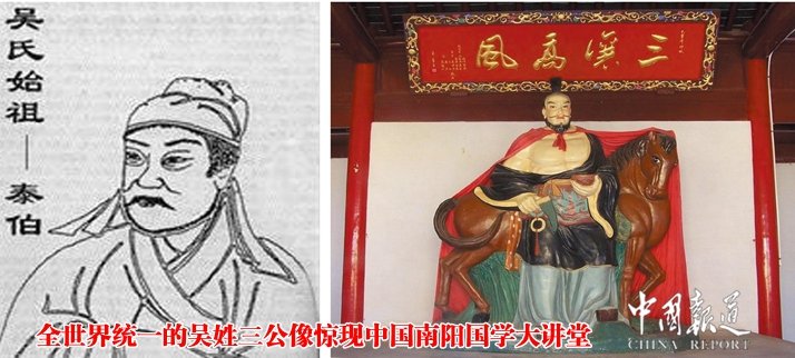 为什么要统一“三公”像?早在 1300 年前唐朝画圣吴道子,曾经为始祖吴泰伯和孔子画过像,目前全世界使用一张面孔的孔子像就是画圣吴道子所画的“先师孔子行教像”,而画圣吴道子所绘始祖吴泰伯像却未统一,其形象各异,千姿百态,面目不一。供奉和张挂于宗庙、祠堂之上,绘制在族谱之内的始祖像被后世随意刻画,一个始祖多张面孔,这是对祖宗的极大不敬,难怪有些宗亲在议论,为什么现在吴家出现不协调、不团结的问题这么多呢?究其原因是与所供奉的得姓始祖泰伯、传代始祖仲雍、继祖季札“三公”像形态各异、相貌不一有关。到底哪一位是我们的始祖呢?现将其画像分别展示如下。